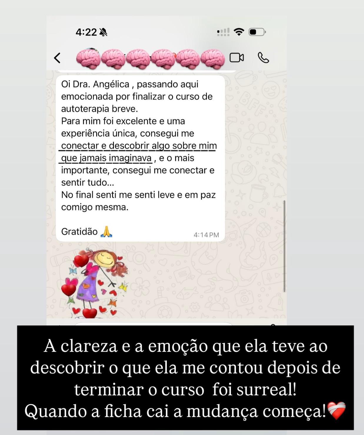 Angélica começou sua trajetória Terapêutica, para se curar das dores de uma raiz de abandono medo e rejeição profunda que viverá na infância a fazendo crescer com uma autoimagem desajustada e um baixo senso de merecimento e isso gerava uma solidão profunda acompanhada por uma sensação de desproteção e insegurança.
